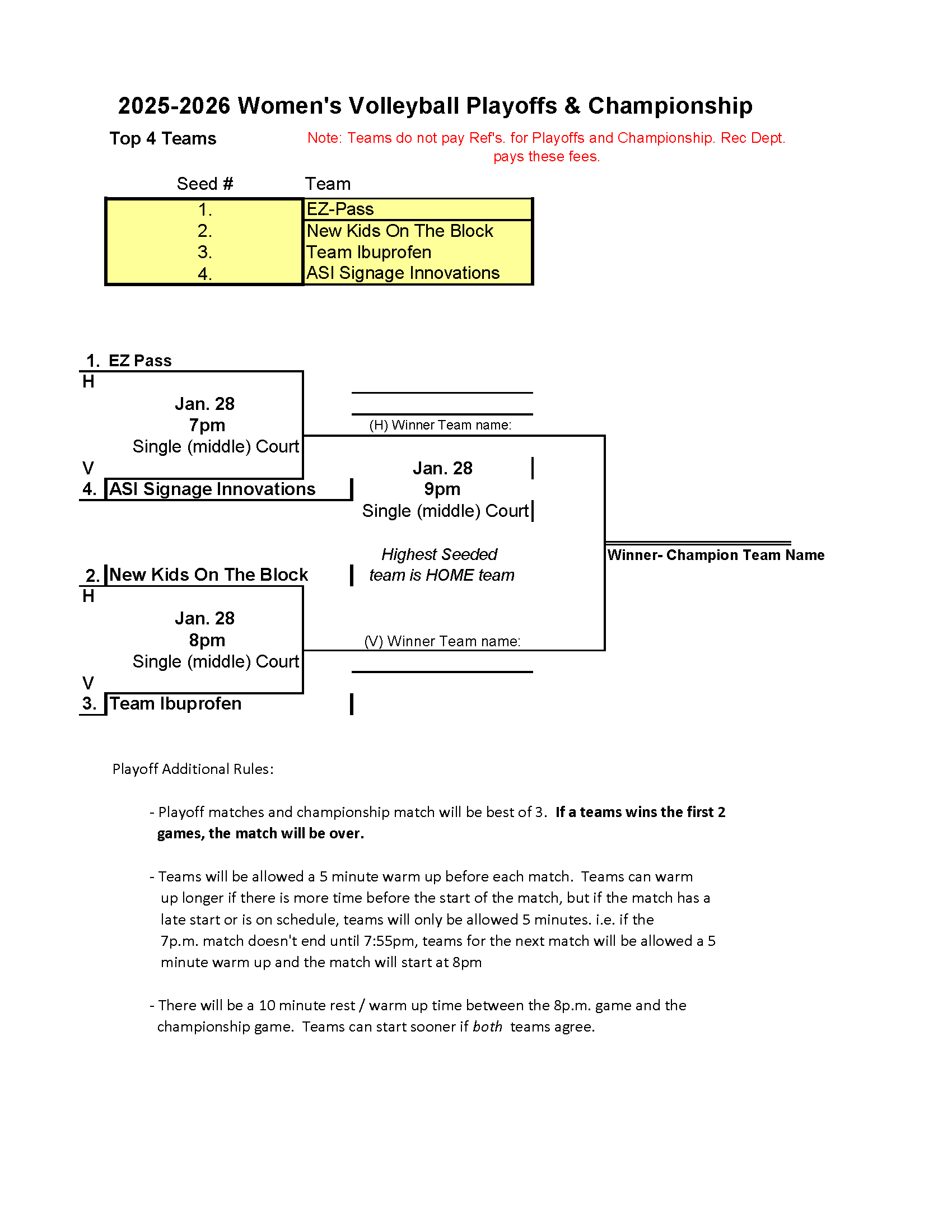 *Min. of 4 teams to play, Women’s Max 10 teams